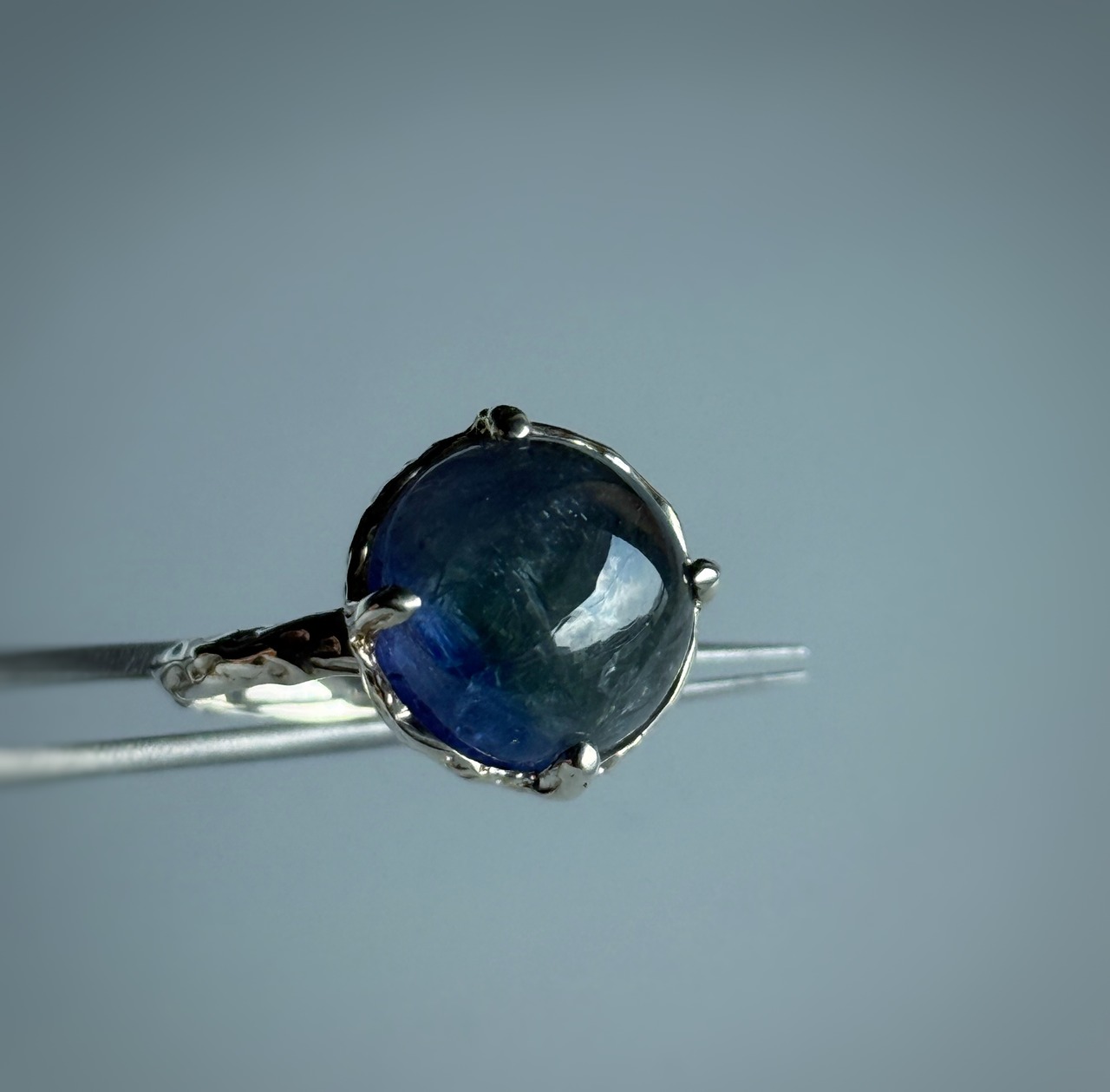 光の当たり方によって柔らかく揺れるシラーも見られます。これはタンザナイト内部の微細な結晶による光の効果で、神秘的な表情を生み出しています。