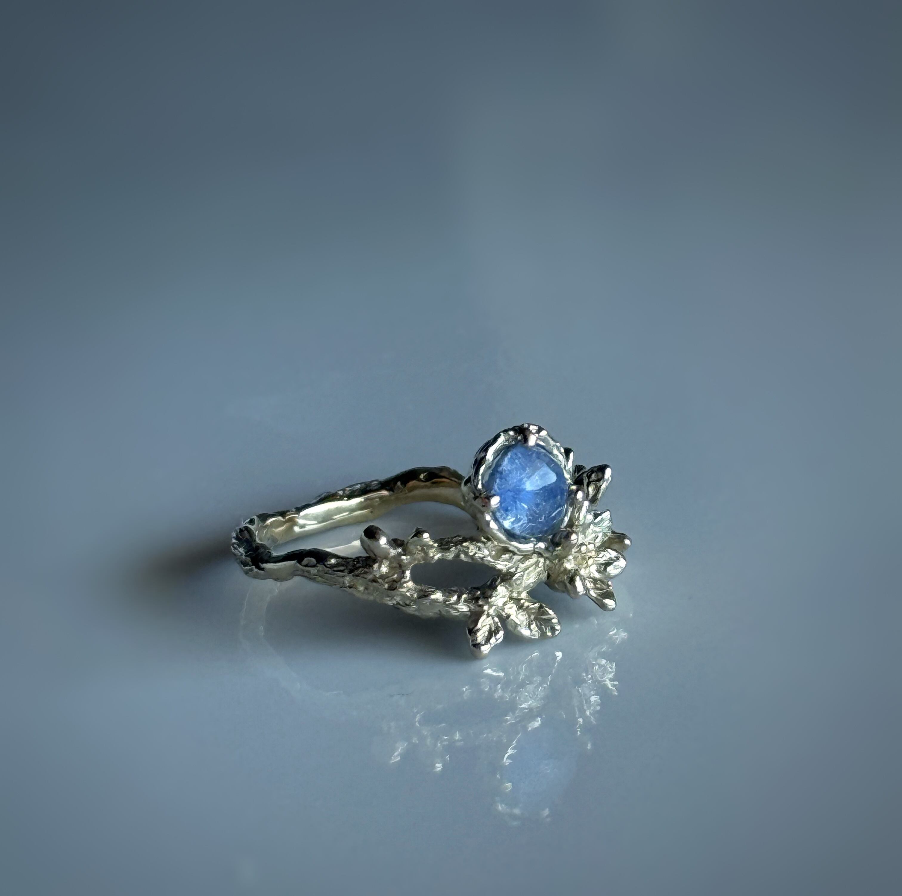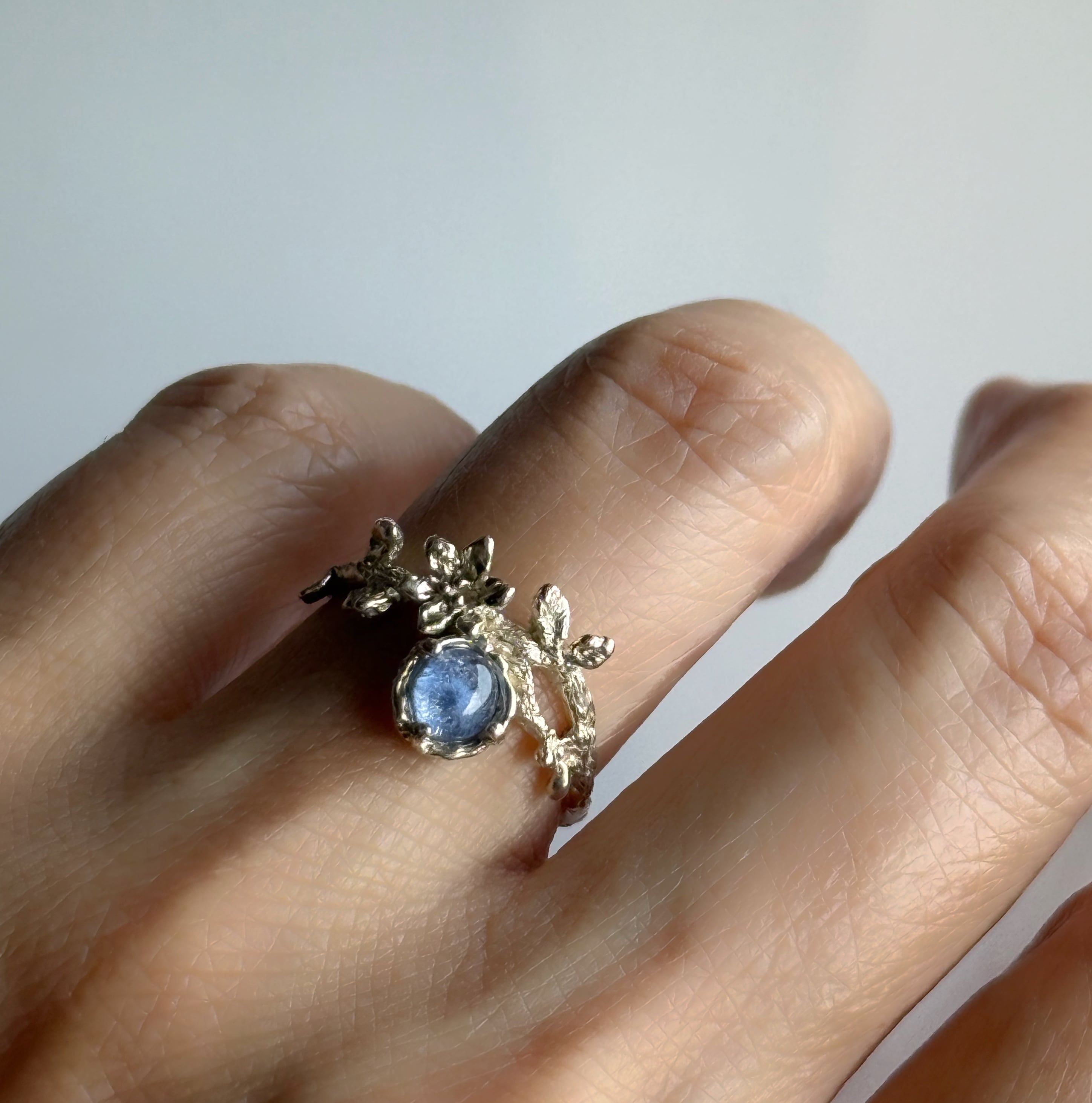 小さなお花が咲くリングにデュモルチェライトインクォーツを添え、k10で1点もののリングにお仕立てしました。