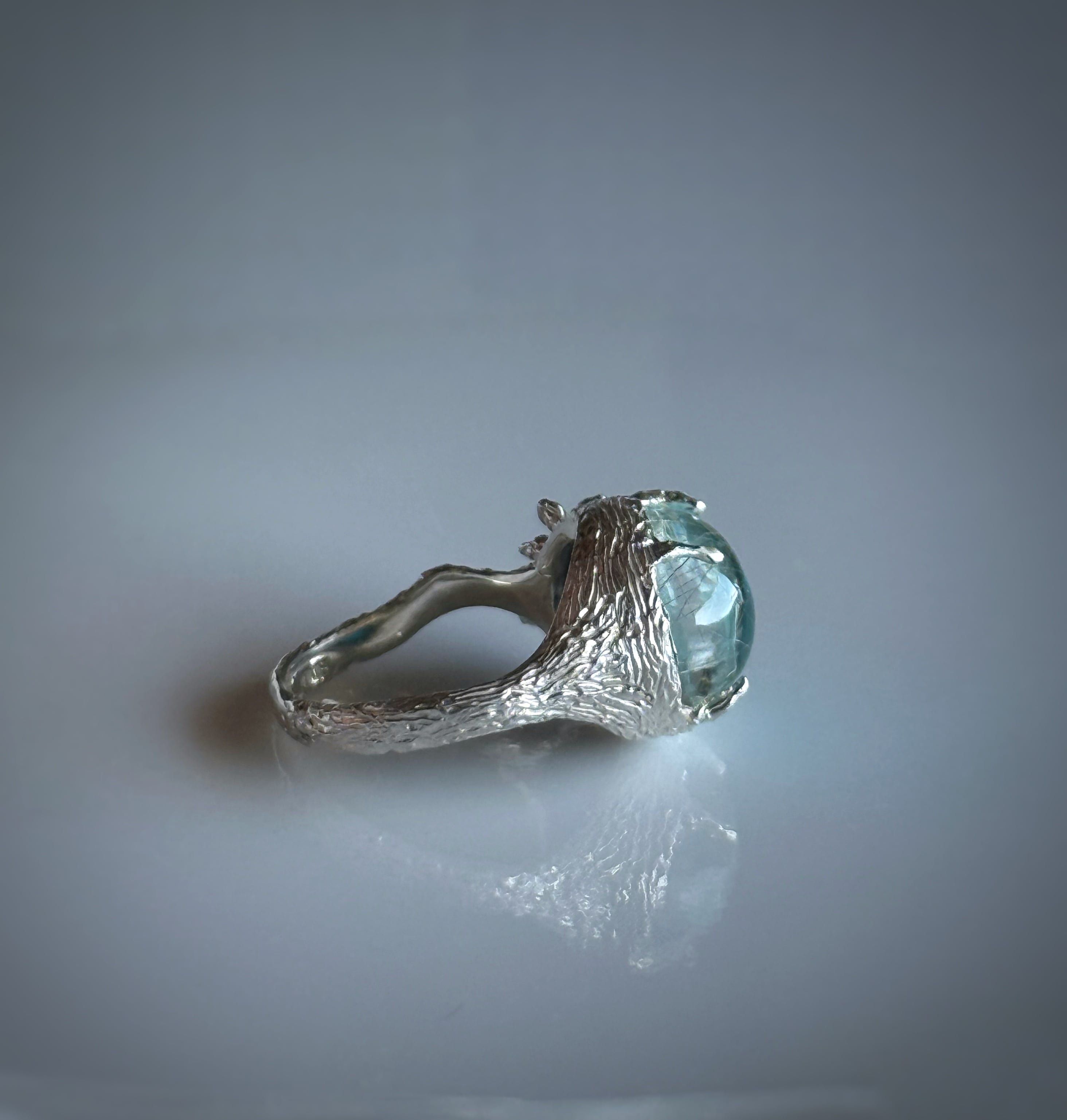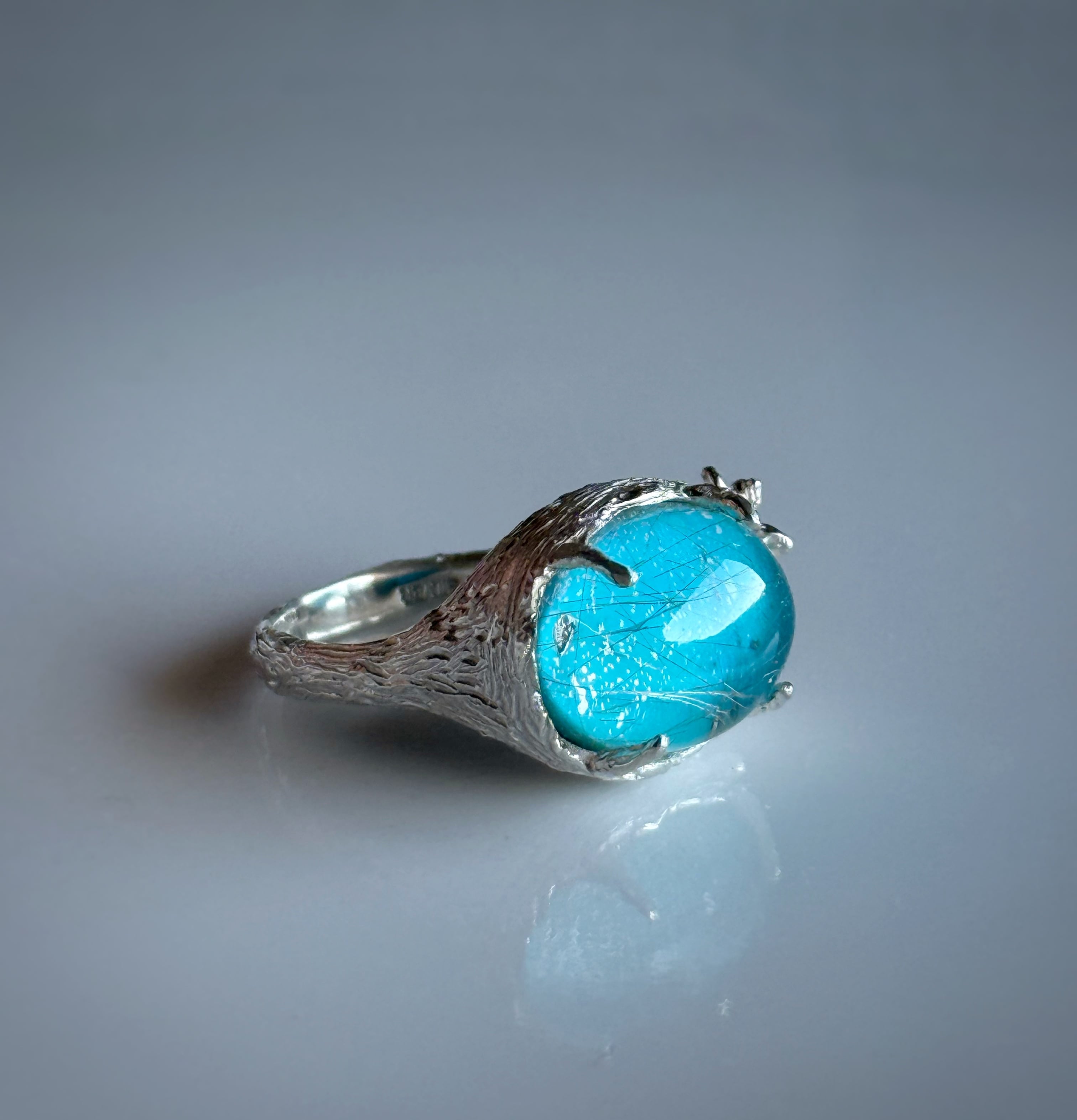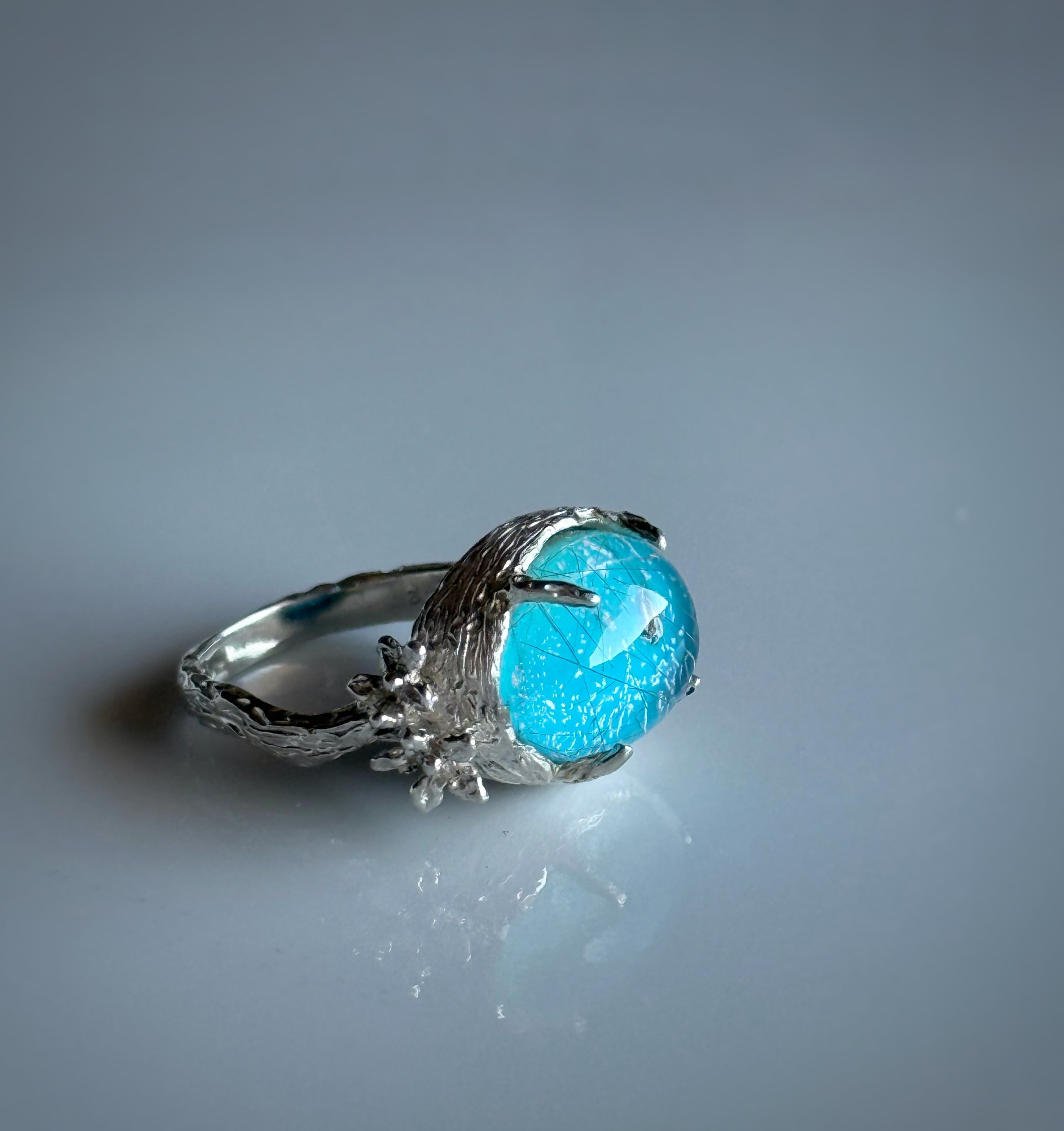 繊細な針状結晶を内包したルチルクォーツと鮮やかなブルーのターコイズのダブレットストーンを使って丁寧にお花の細工を施したリングにお仕立てしました。