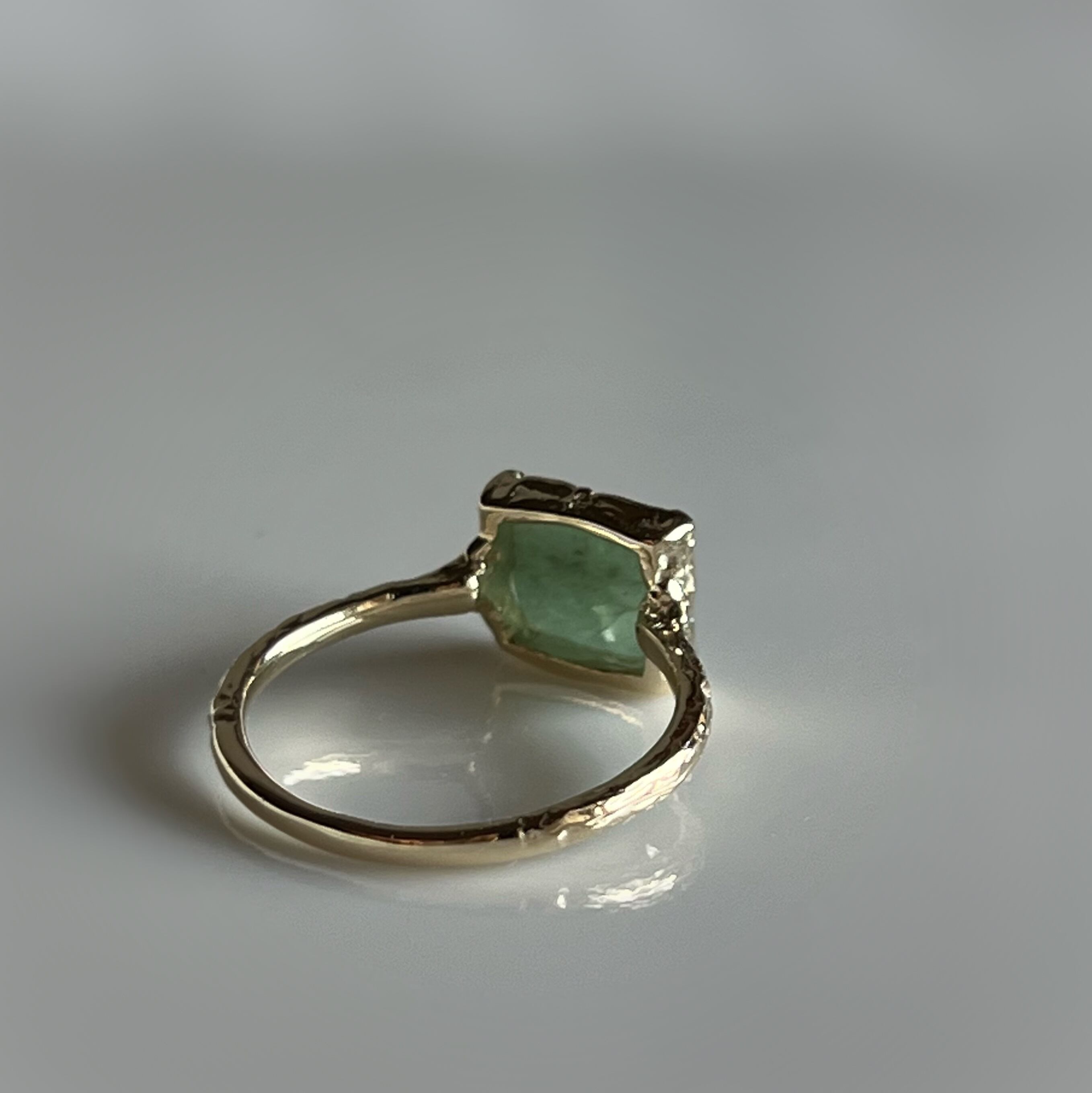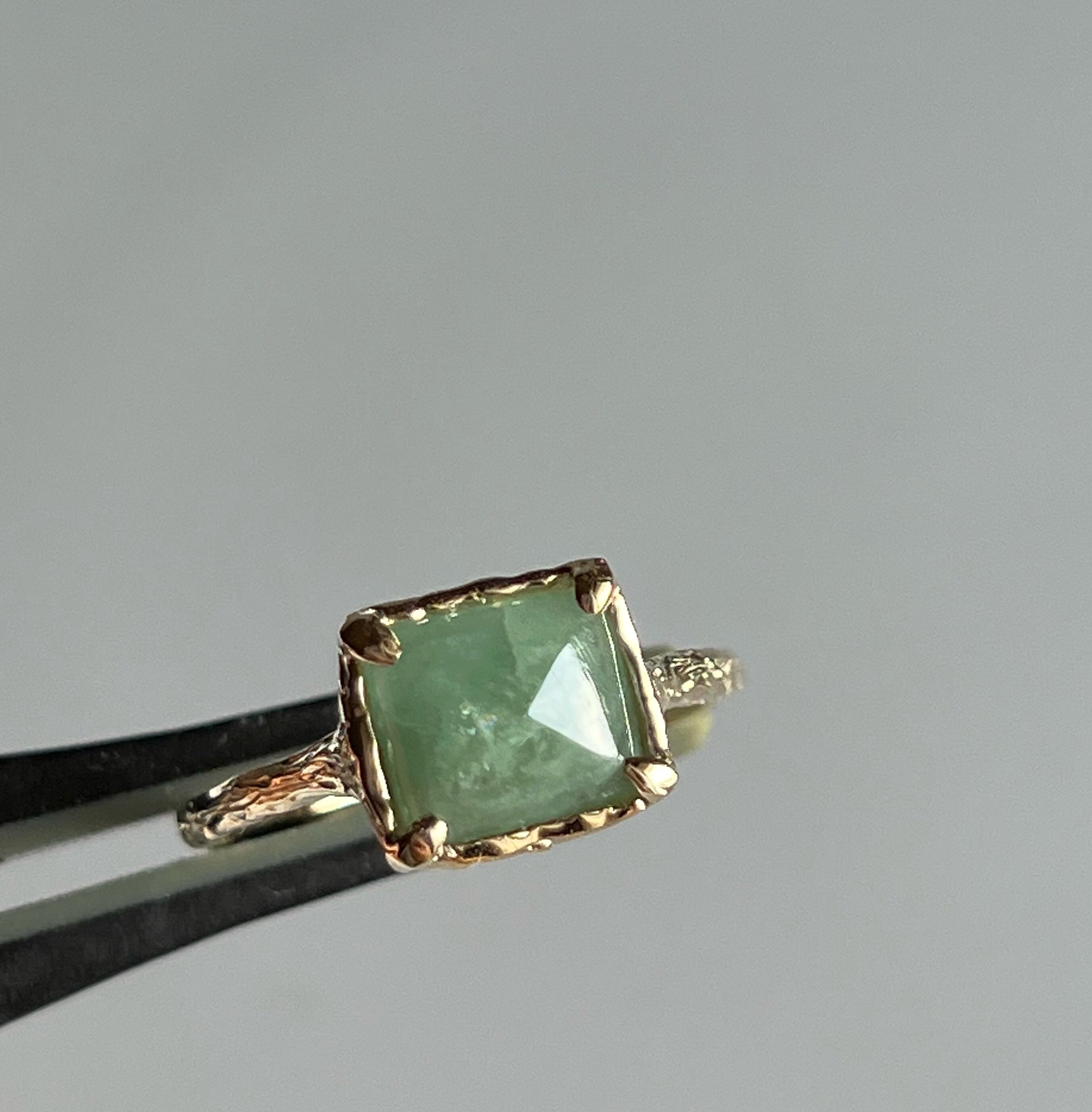 シュガーローフカットのミルキーなエメラルドをk10でリングにお仕立てしました。