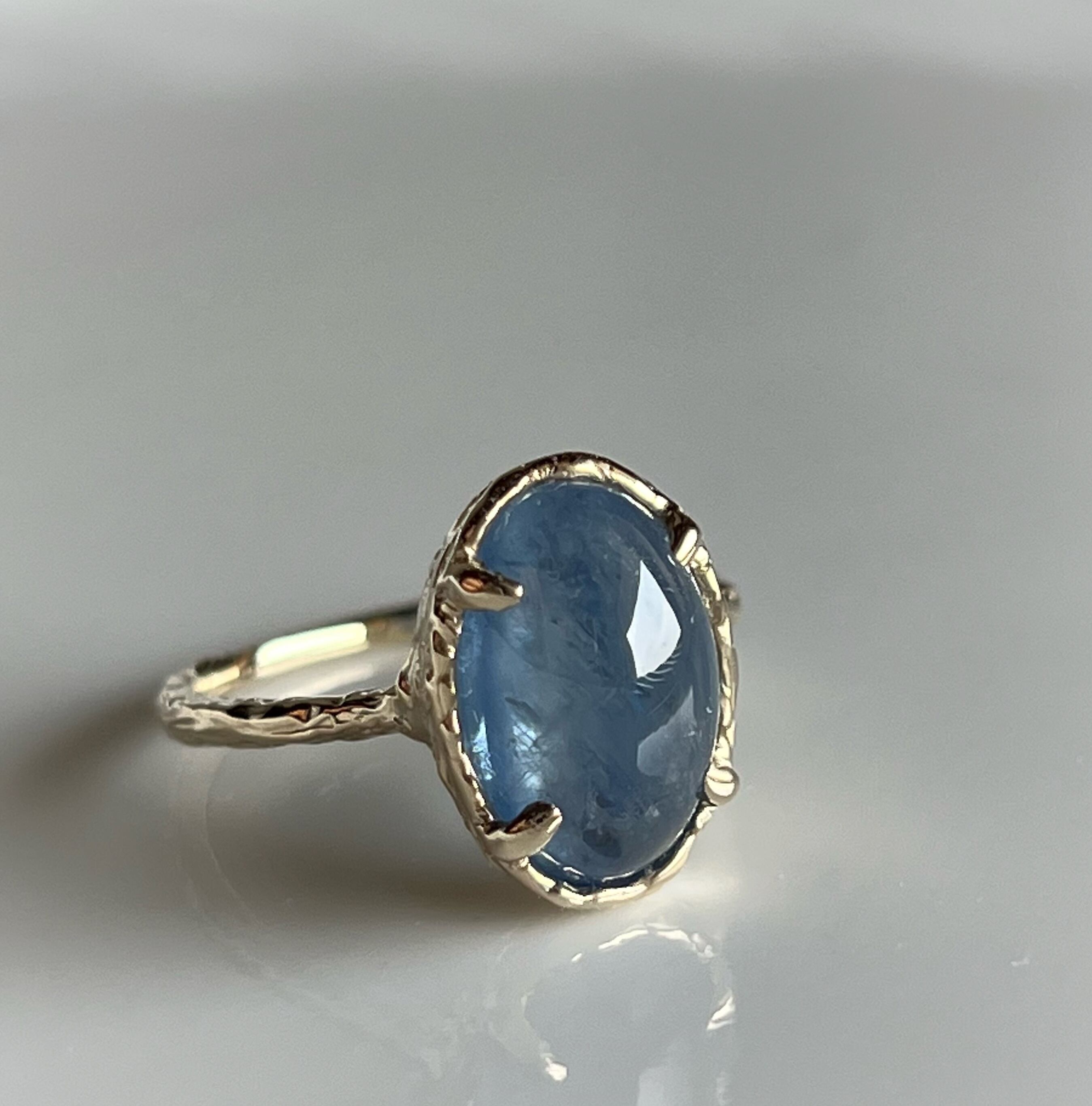 カボションカットが施された非加熱サファイアを、k10リングに仕立てました。