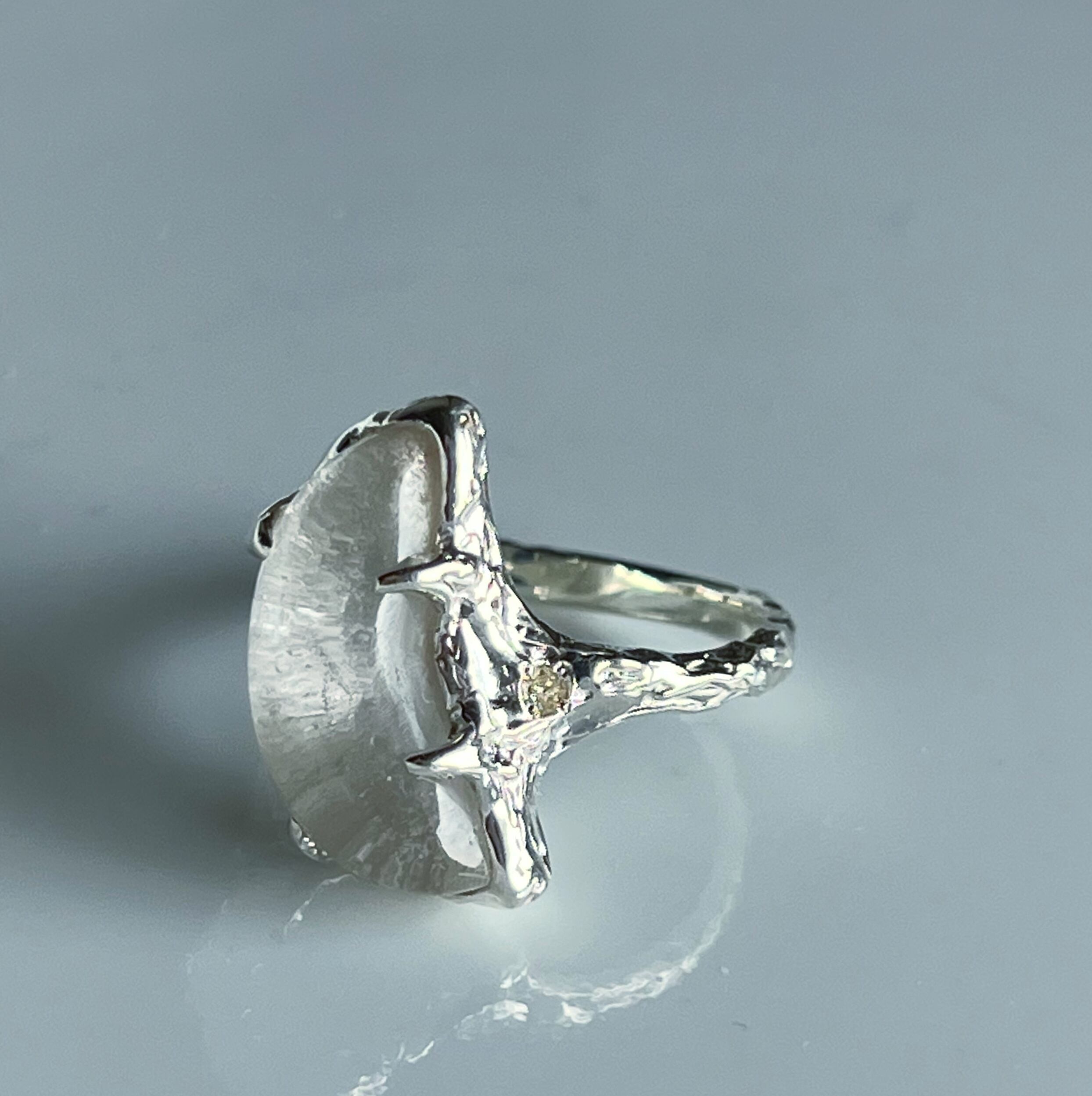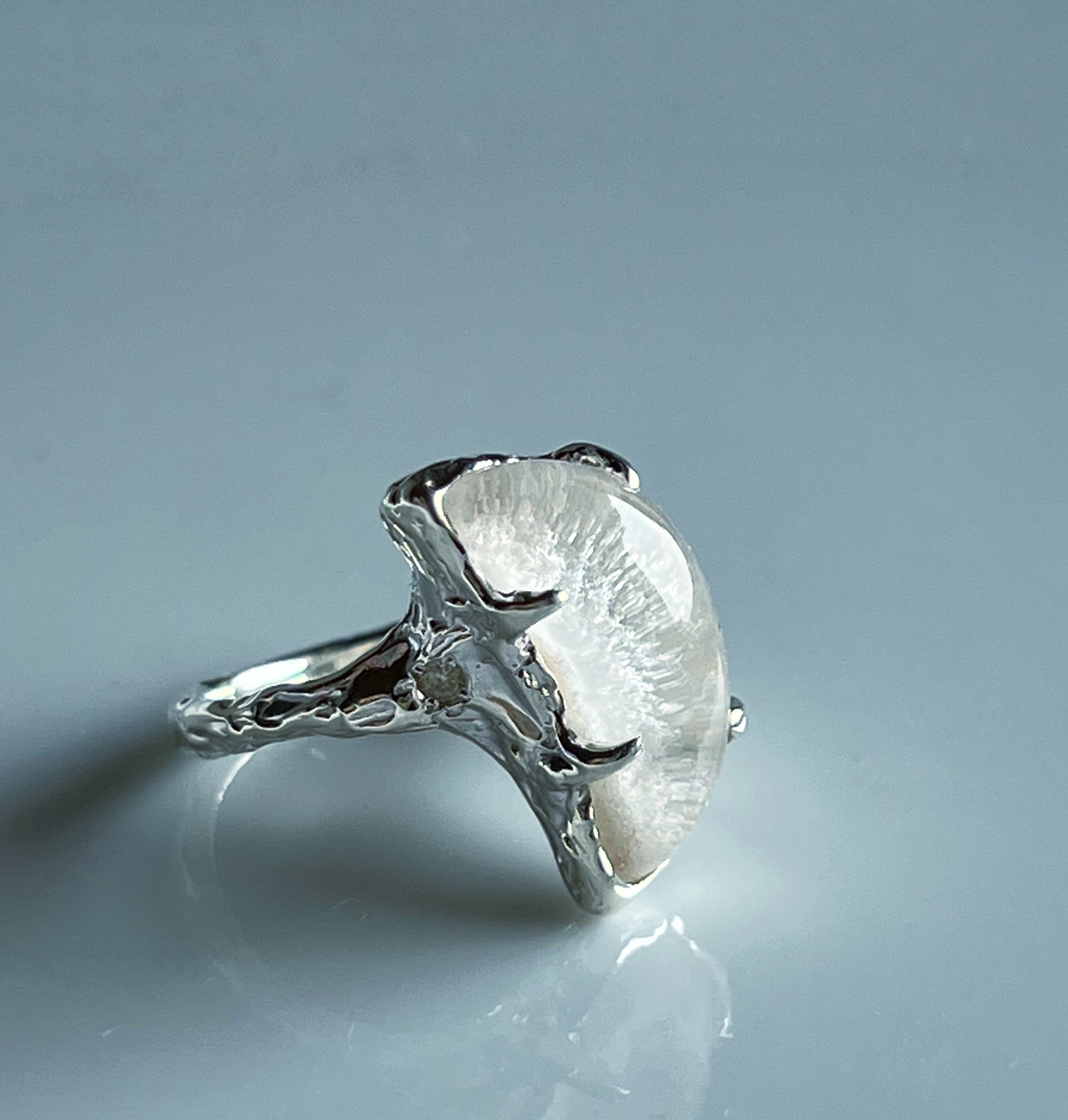 月の形のホワイトガーデンクォーツをsilver925で1点ものリングに仕立てました。