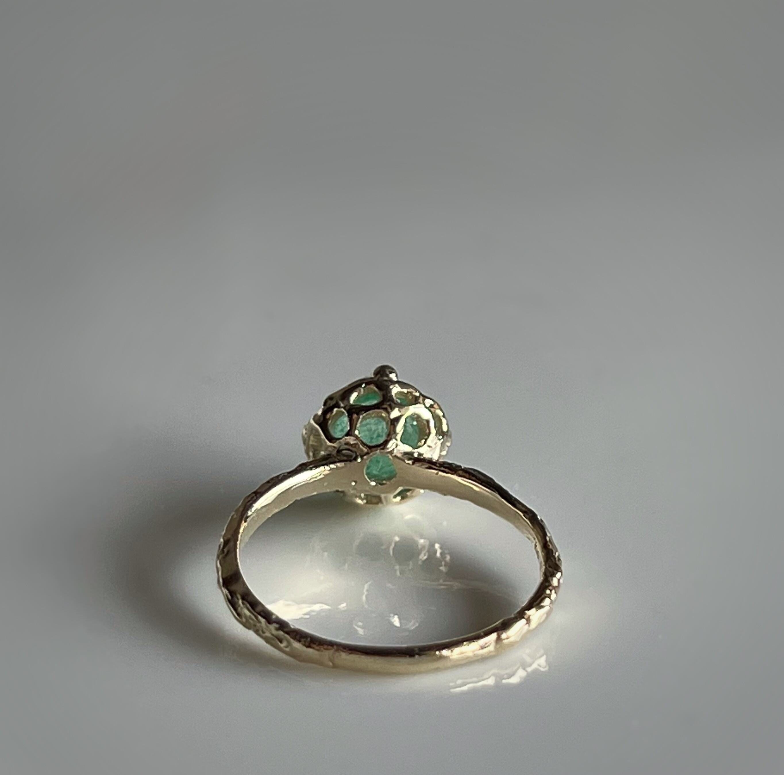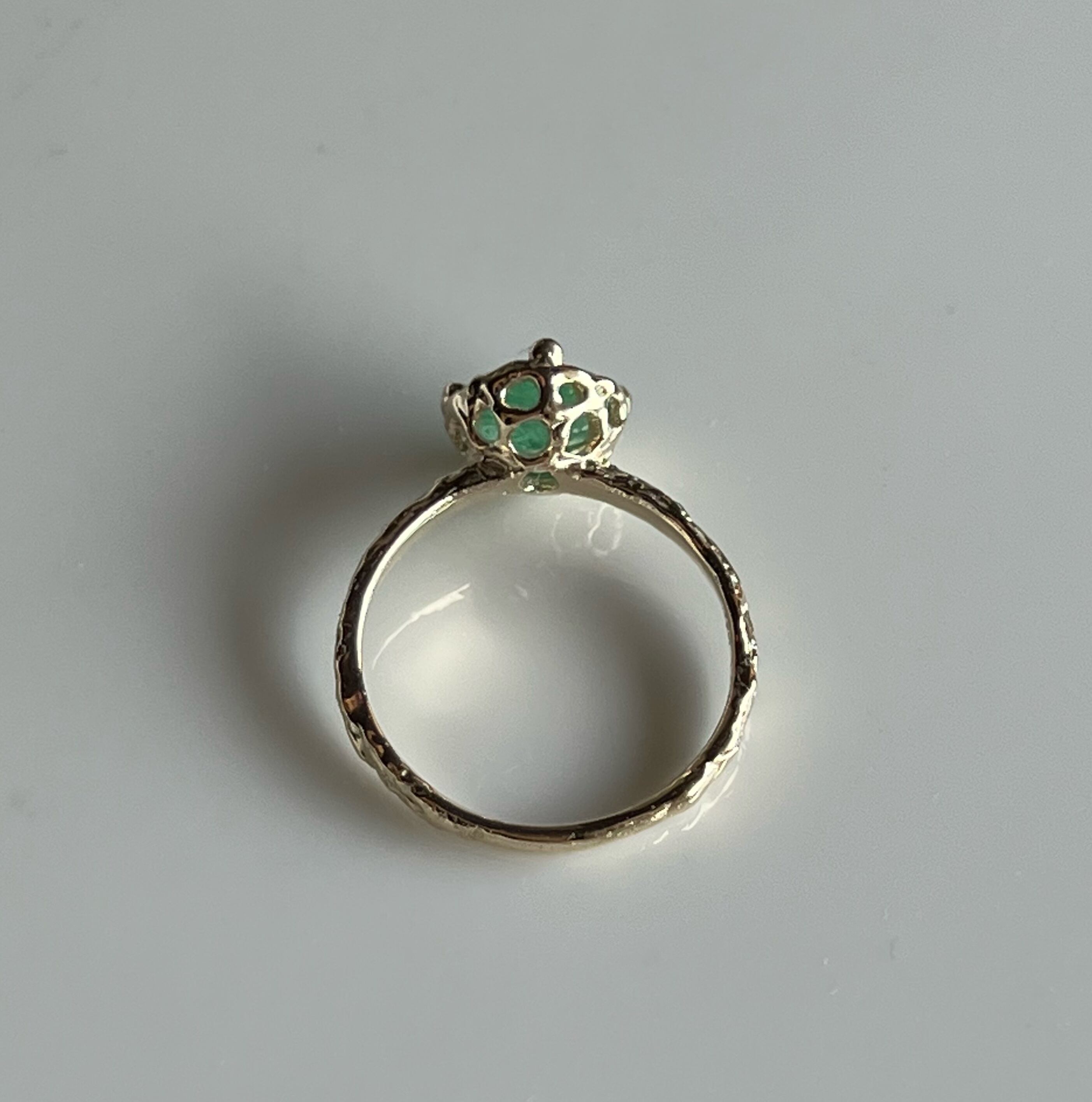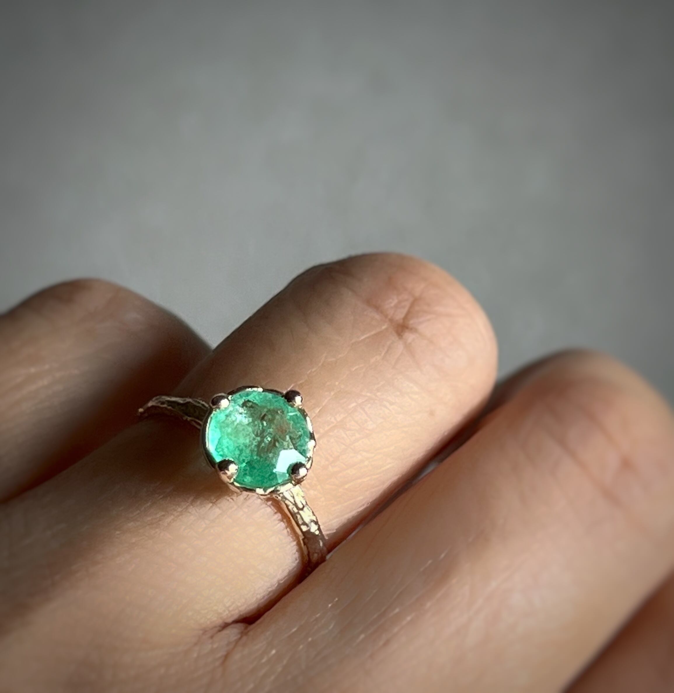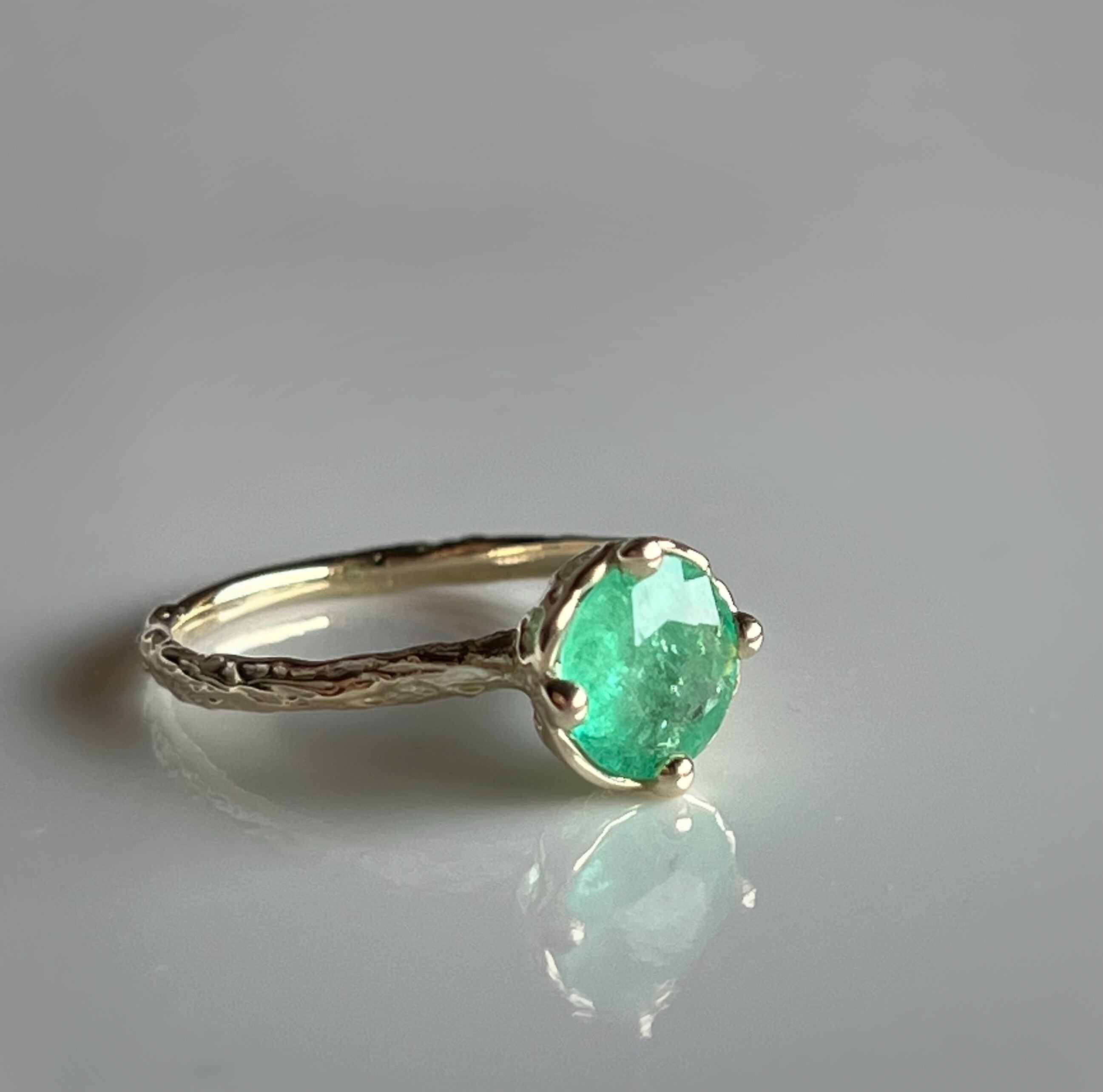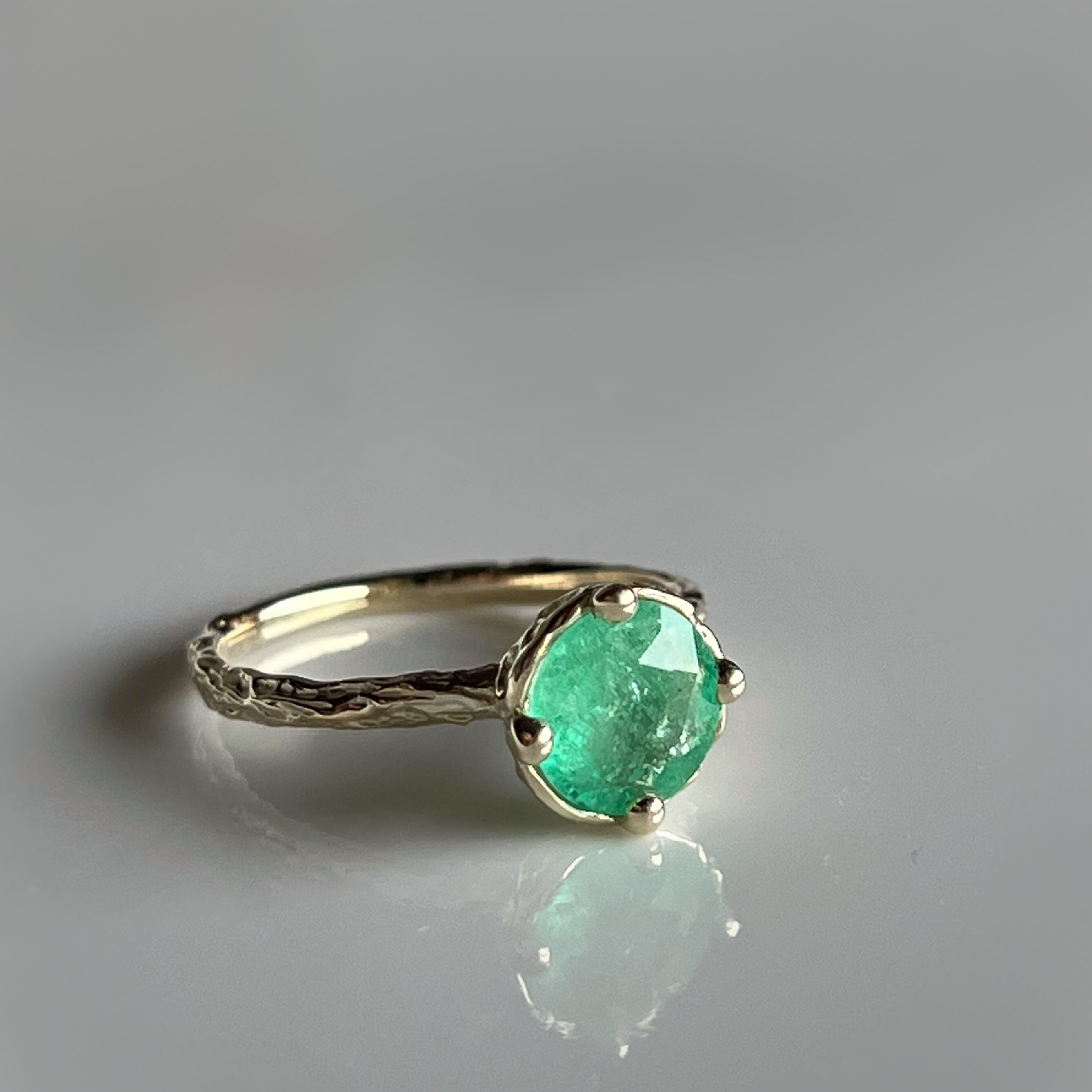 ラウンドファセットカットのエメラルドを、K10で一点もののリングにお仕立てしました。