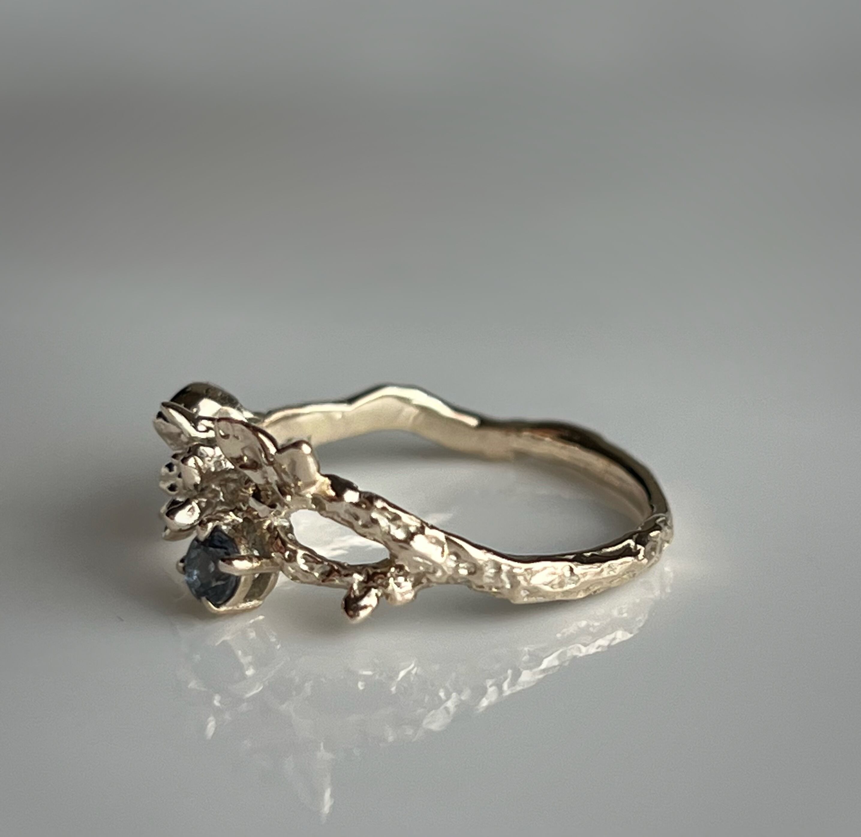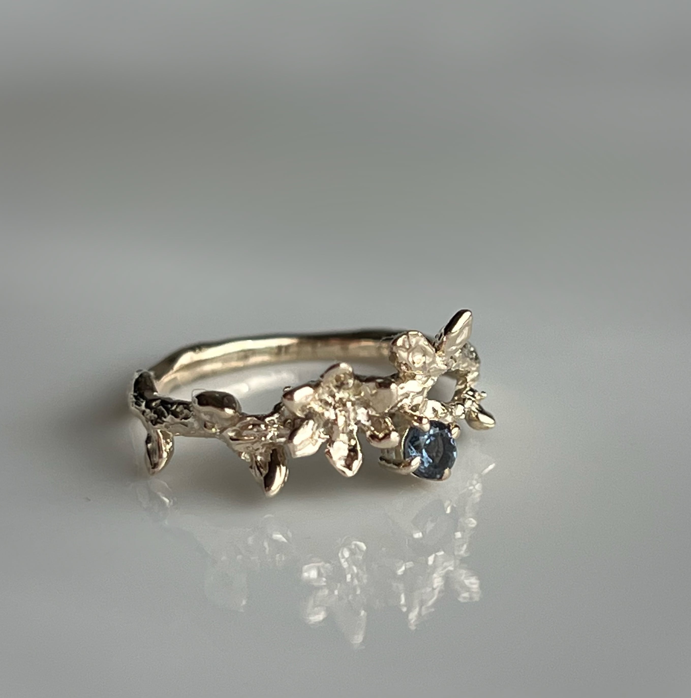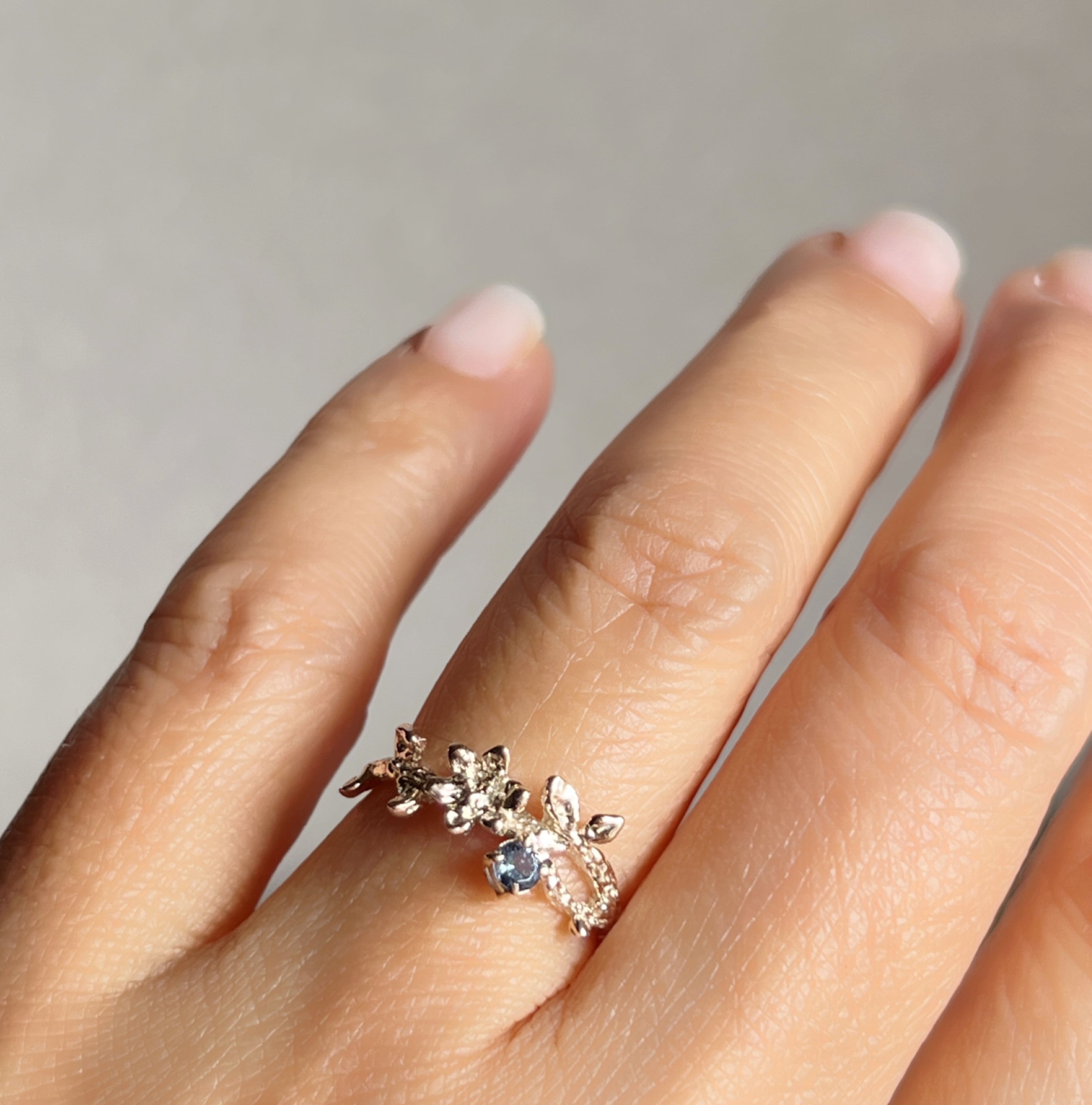小さなお花が咲くリングにブルーのスピネルを添え、k10で1点もののリングにお仕立てしました。