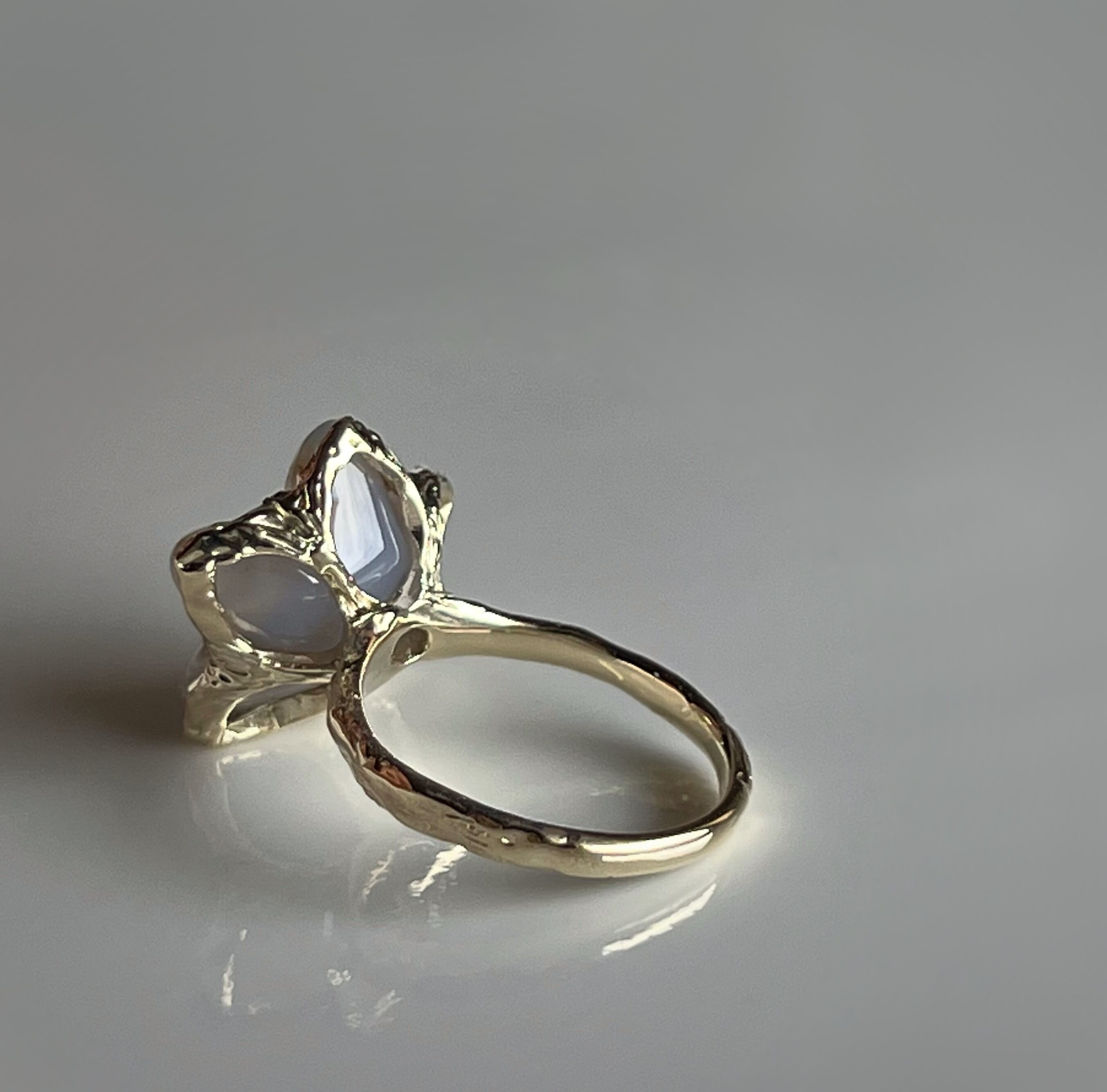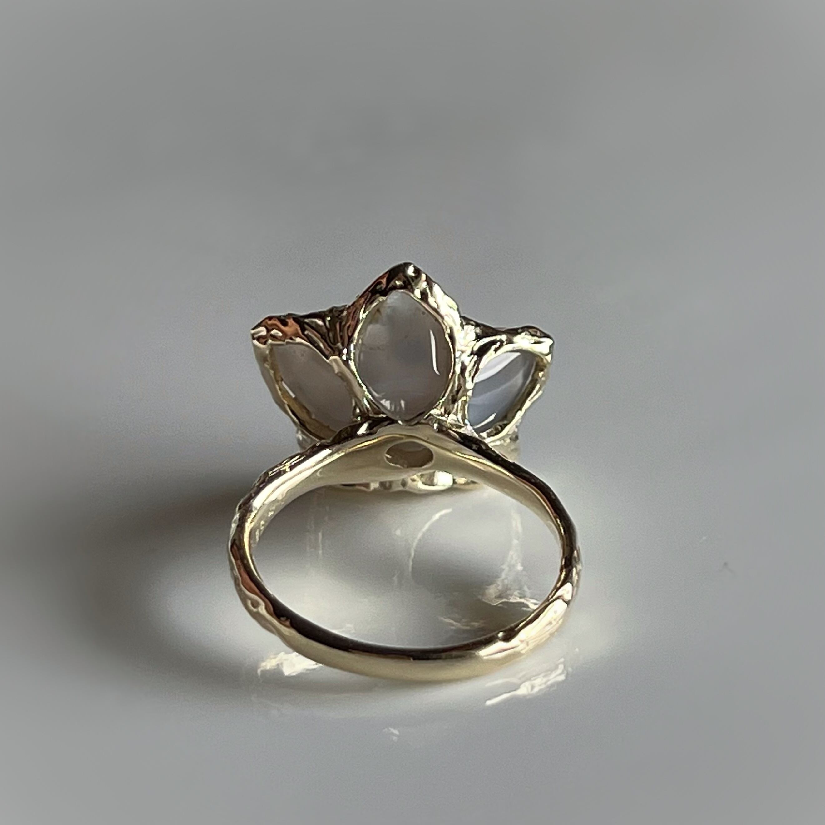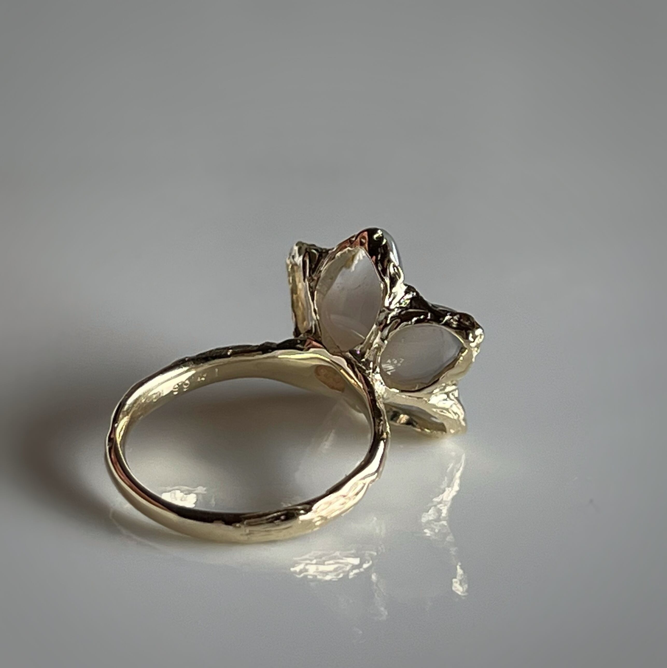 お花の形に合わせて、石座の表側だけでなく裏側まで花びらに沿った精緻な手仕事で丁寧に形作り、金もたっぷり使った贅沢なデザインに仕上げています。