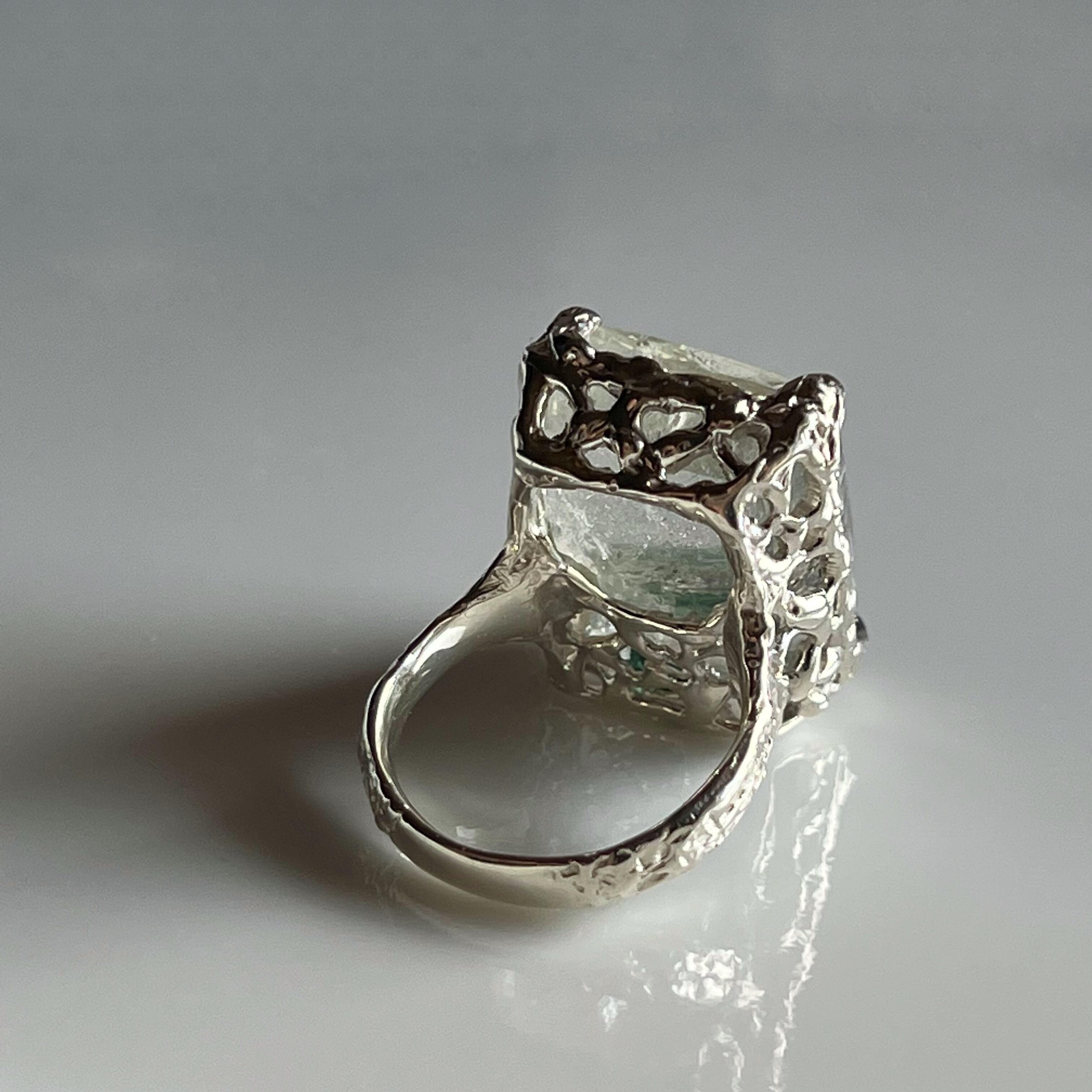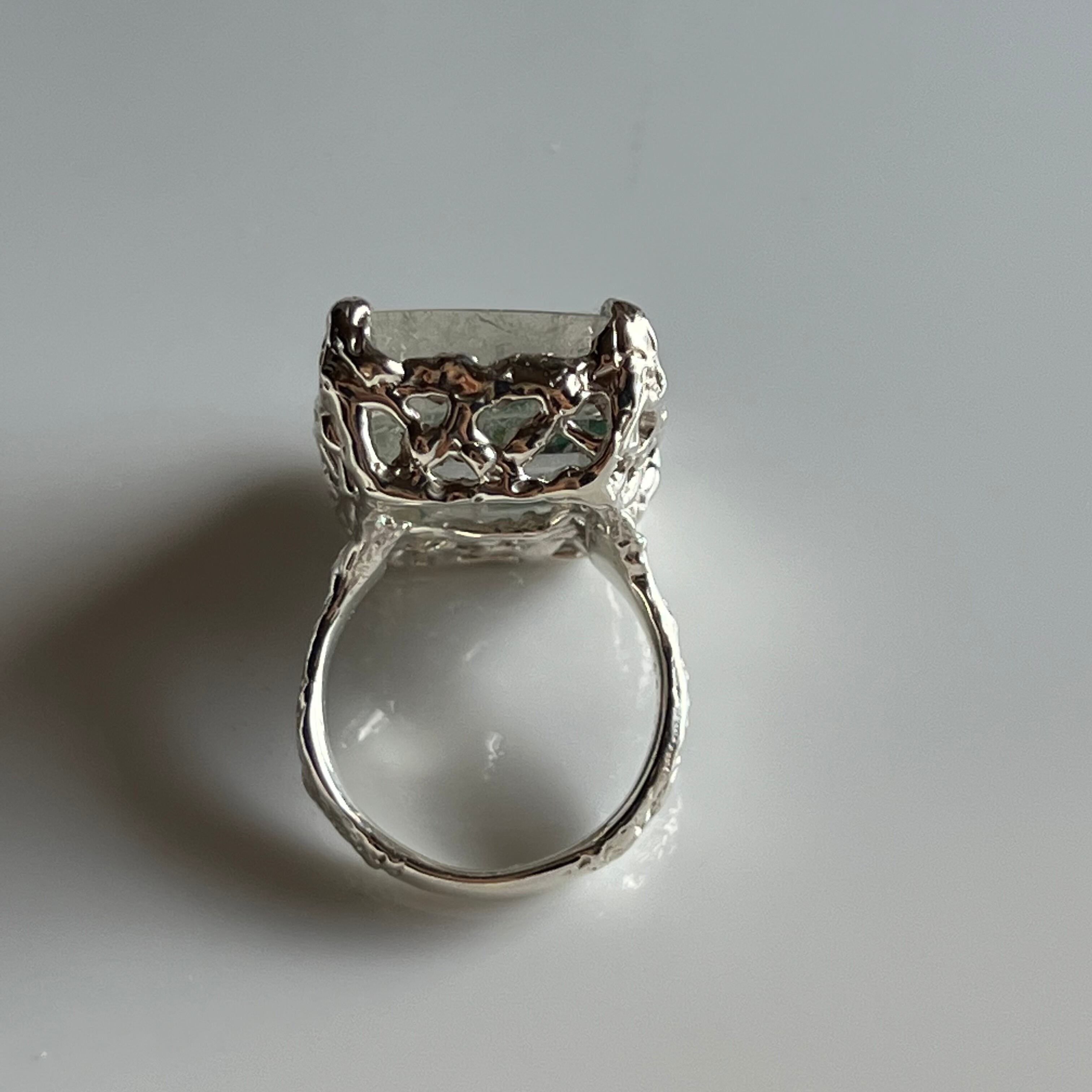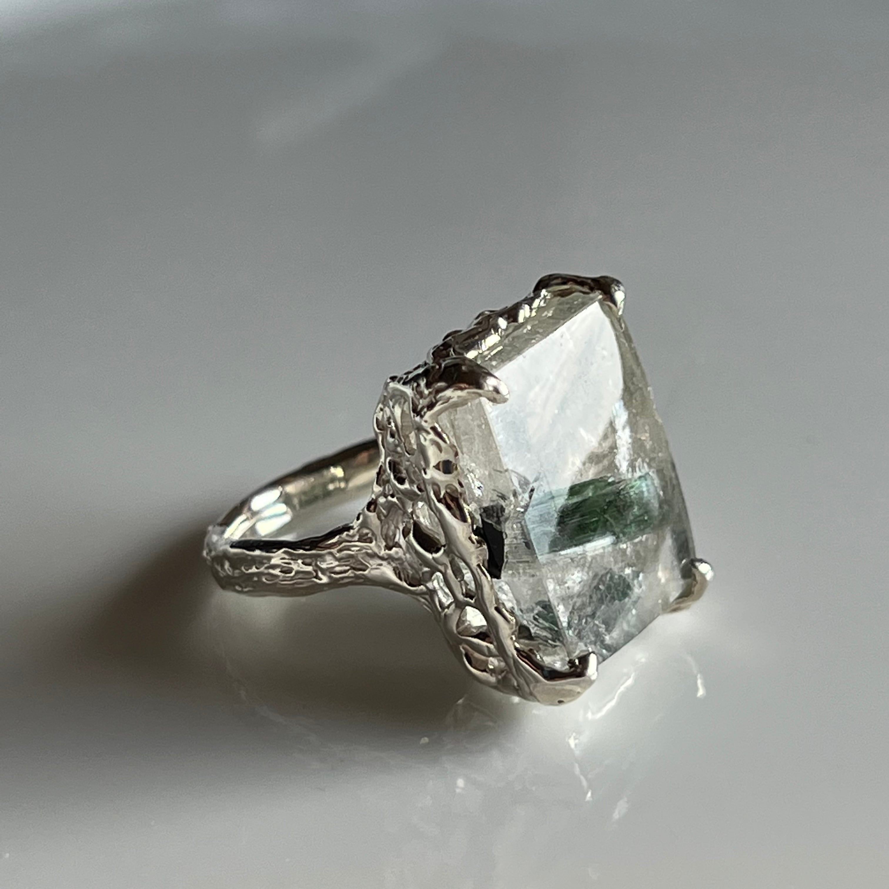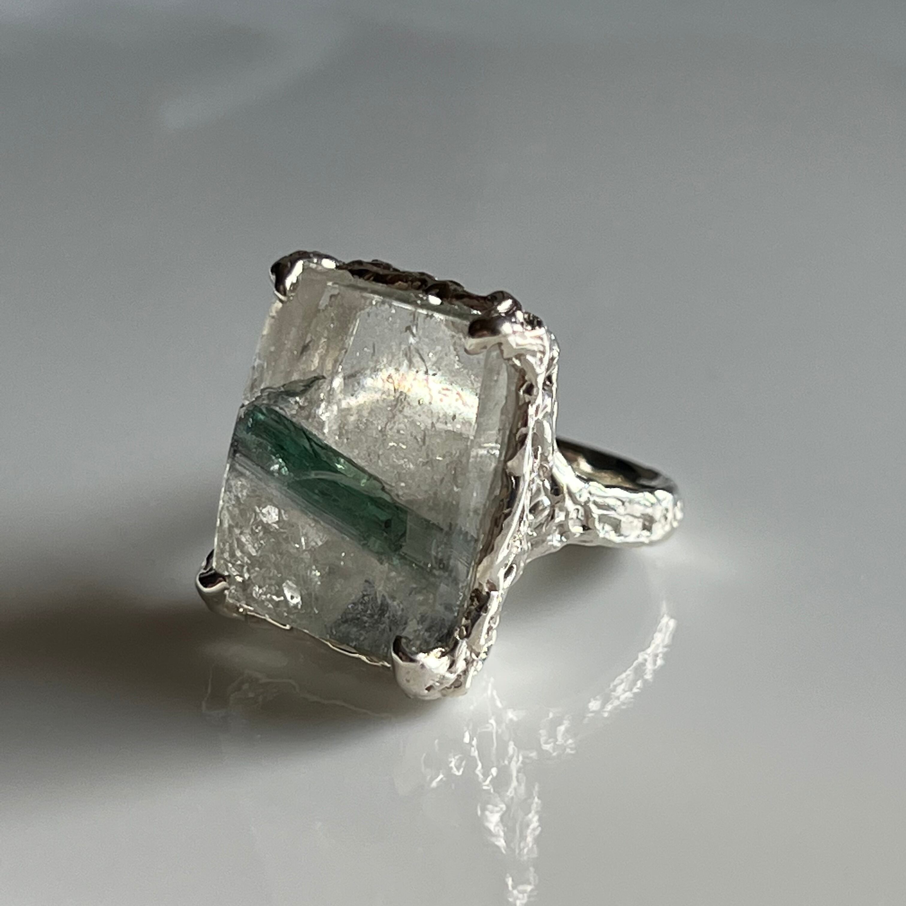 グリーントルマリンの結晶が内包されたクォーツをsv925一点ものリングにお仕立てしました。