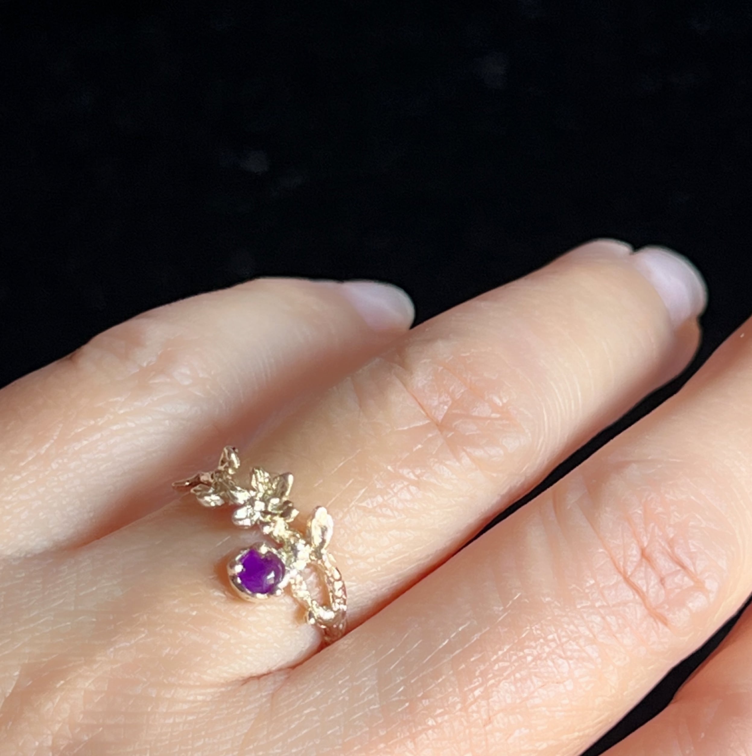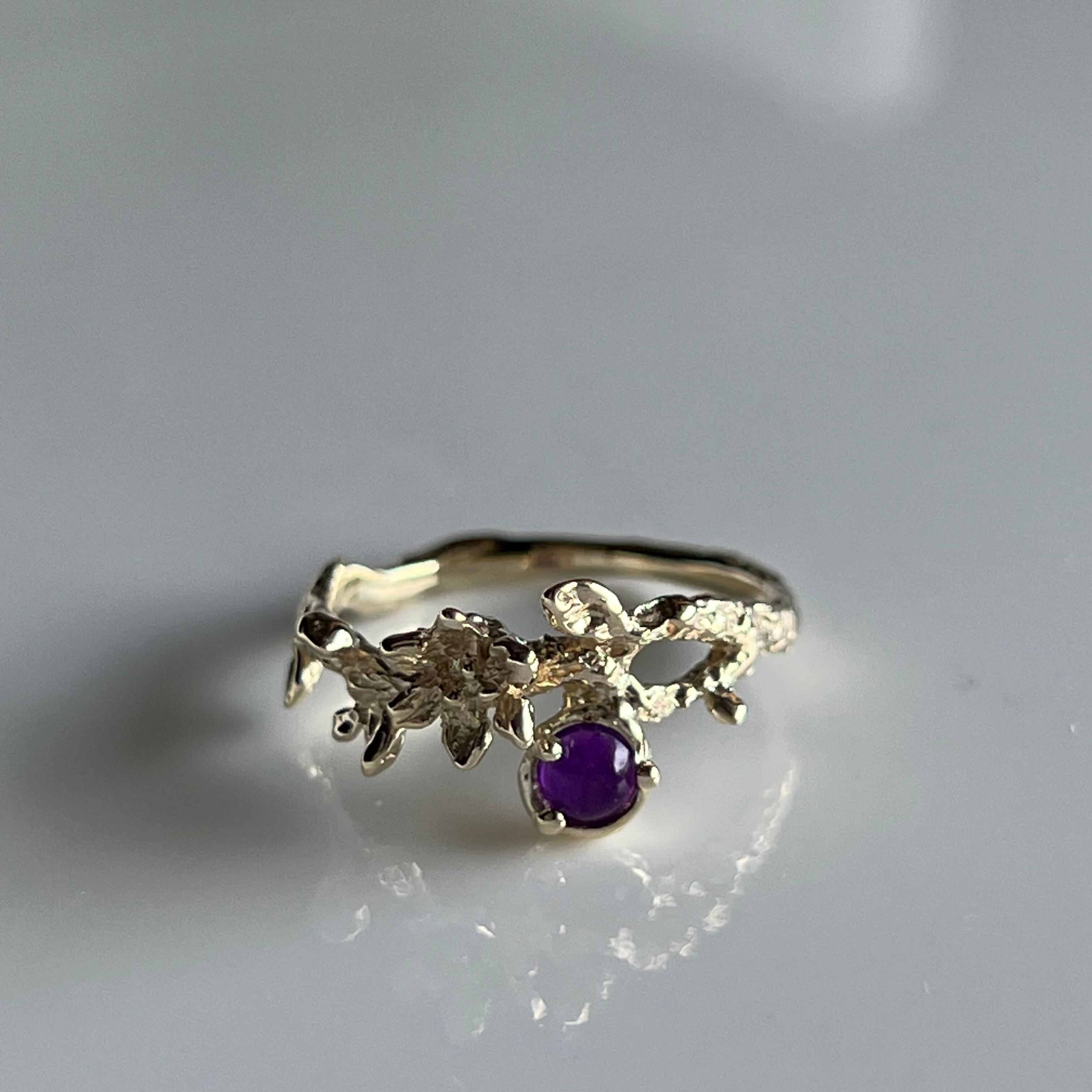 小さなお花が咲くリングにハックマナイトを添え、K10で1点もののリングにお仕立てしました。