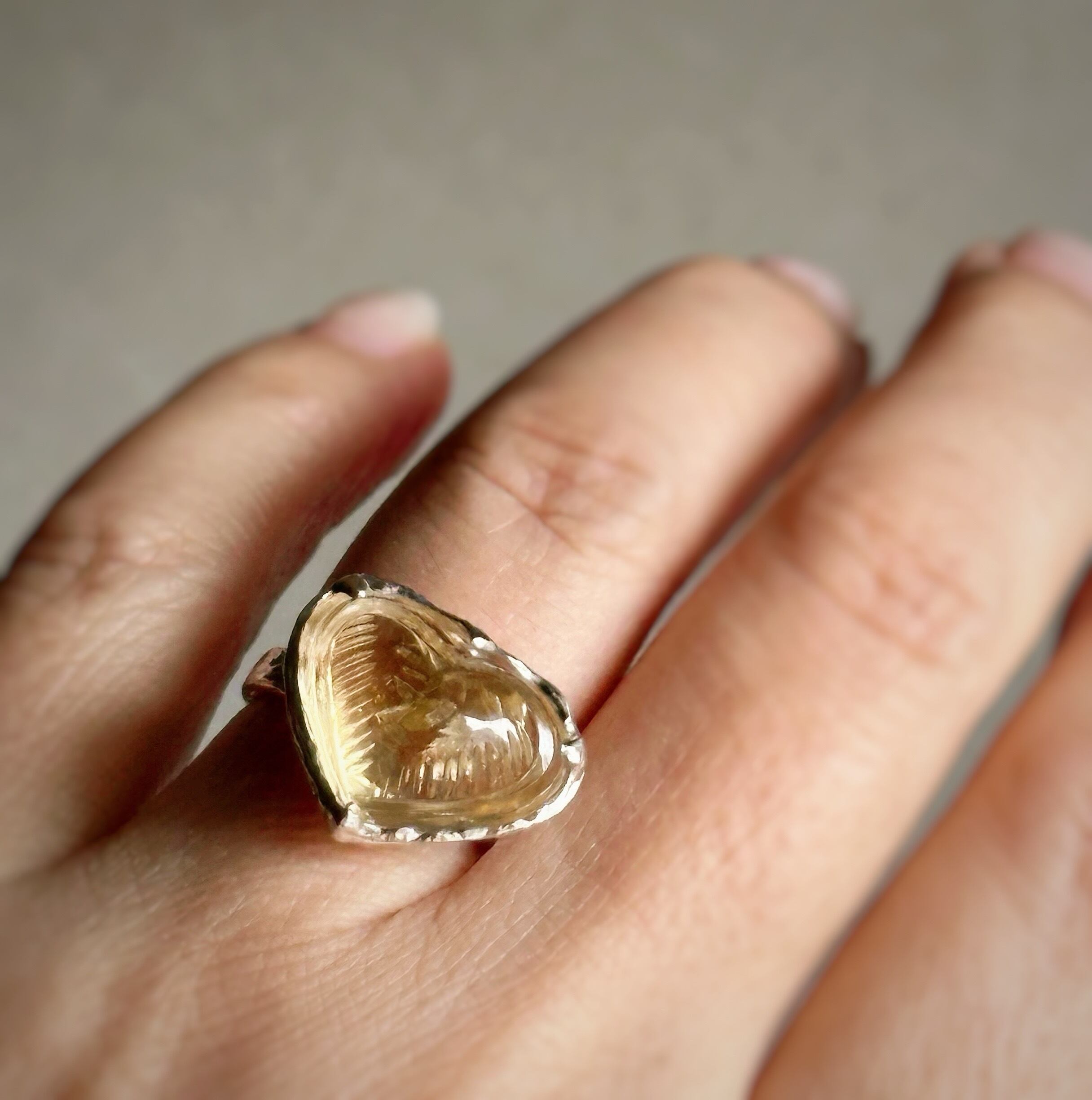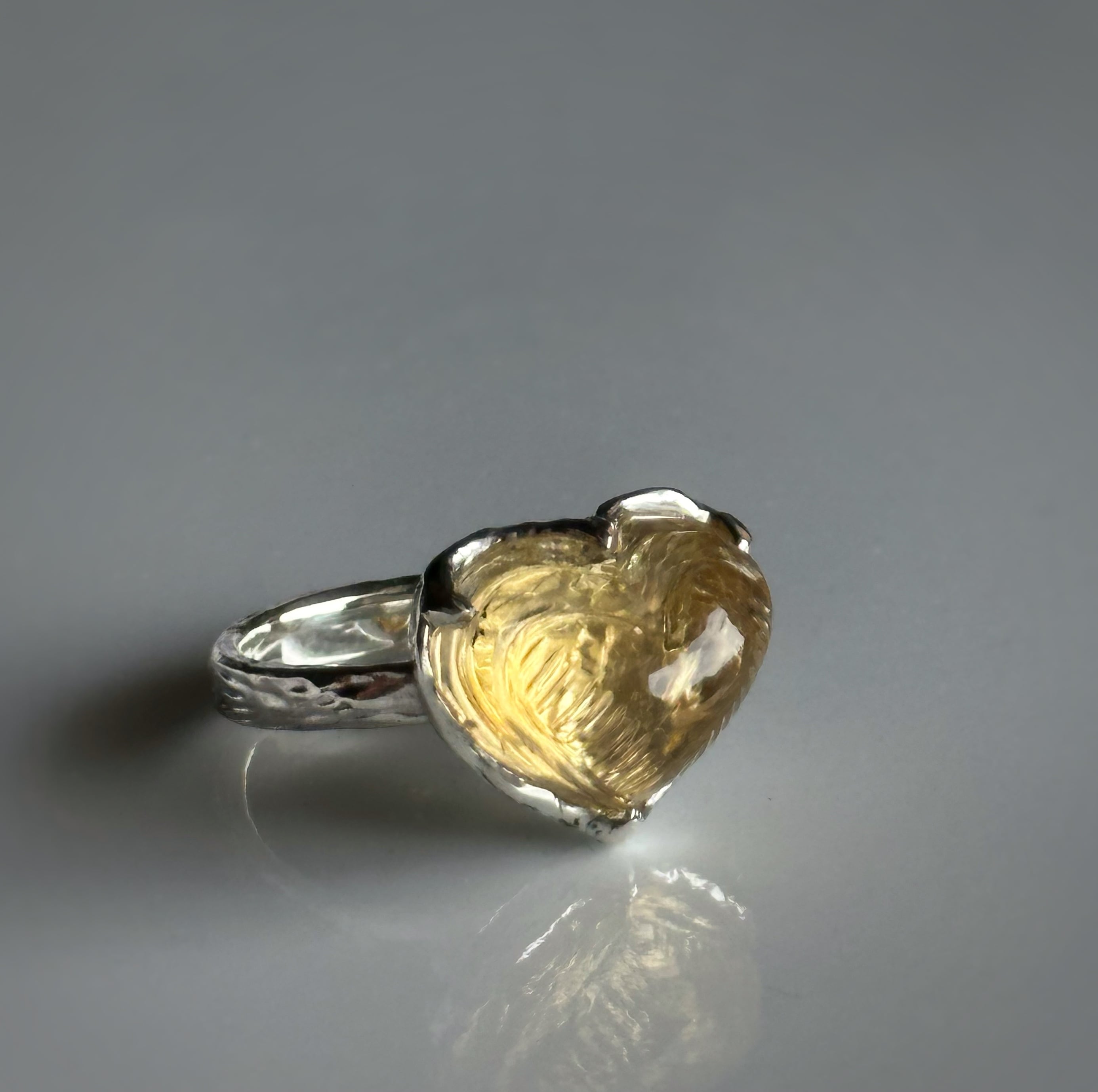高さのあるぷっくりとしたハートシェイプにカービングが施されたシトリンをSV925で一点もののリングにお仕立てしました。