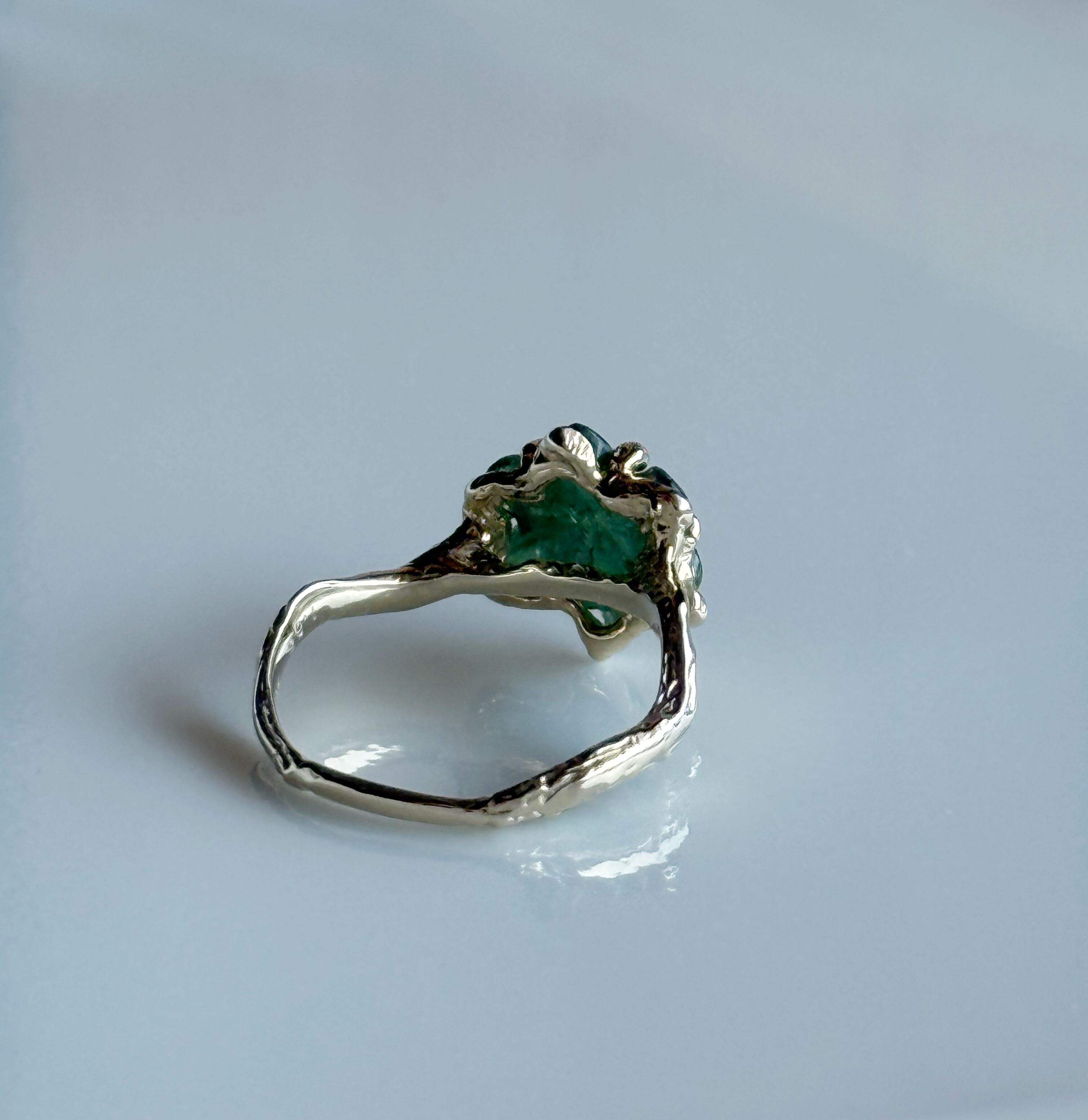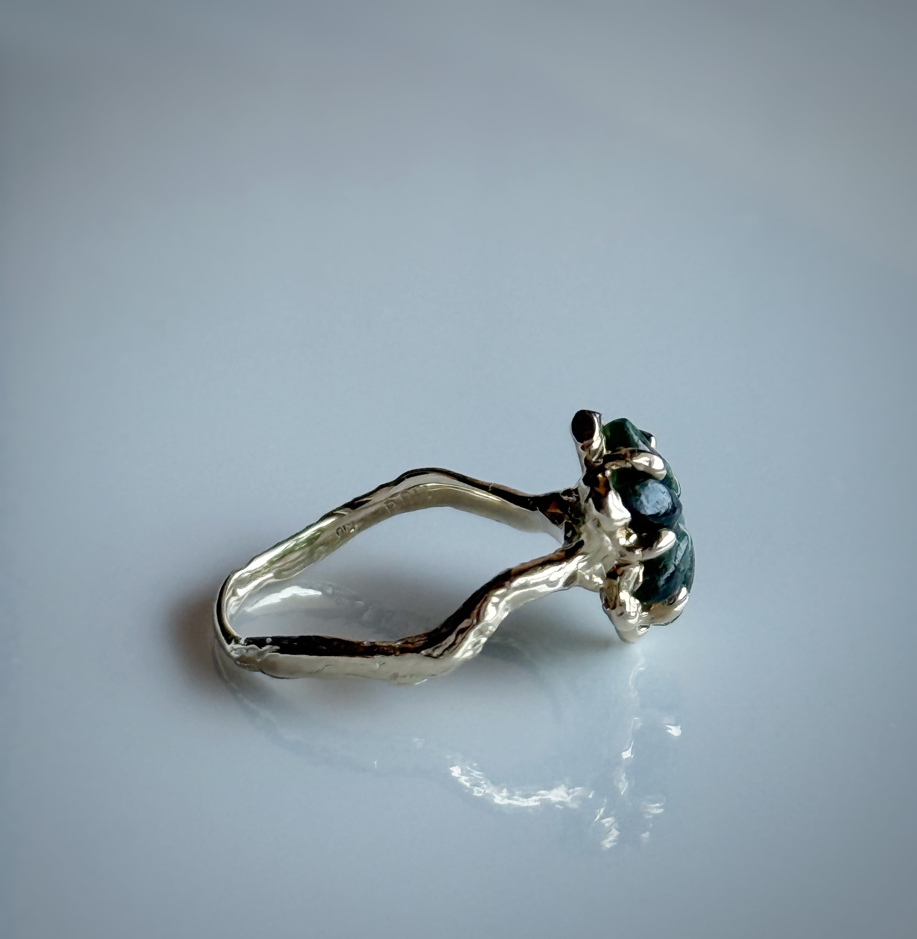 フラワーカービングが施されたお抹茶カラーのグリーンカラーのトルマリンを一点物のリングに仕立てました。