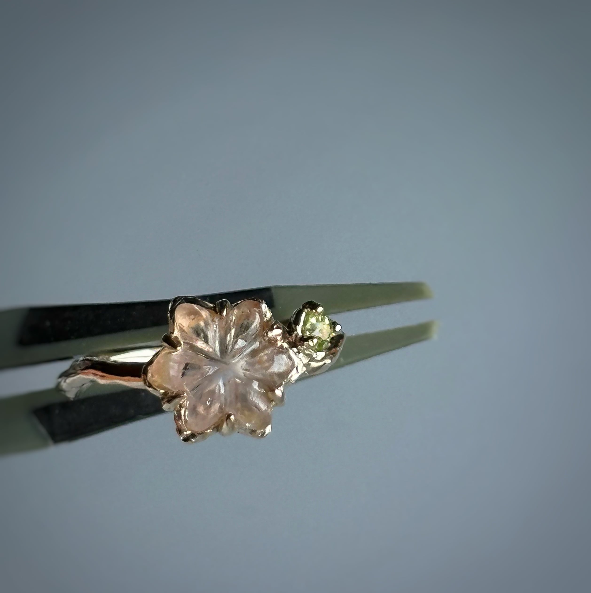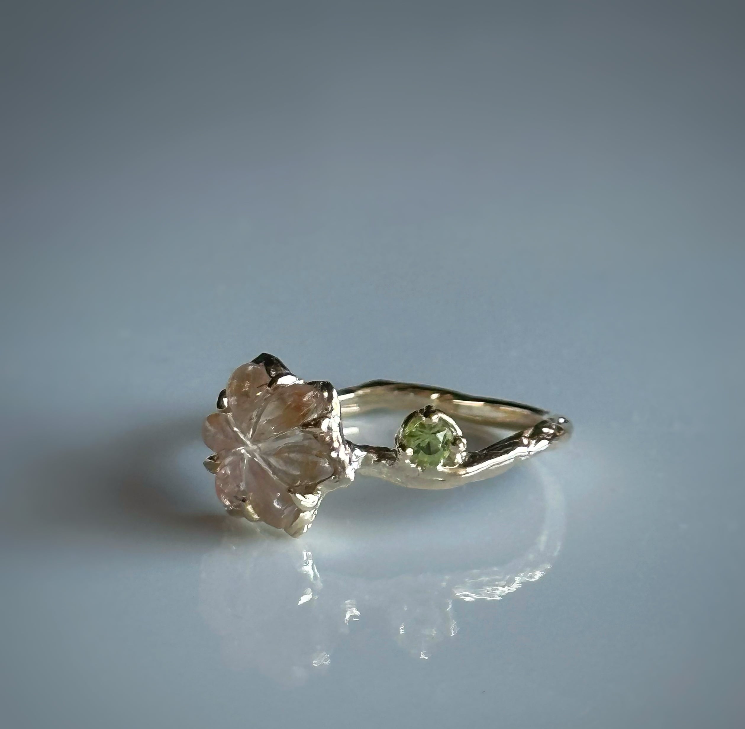 フラワーカービングが施されたトルマリンを、一点物のリングに仕立てました。