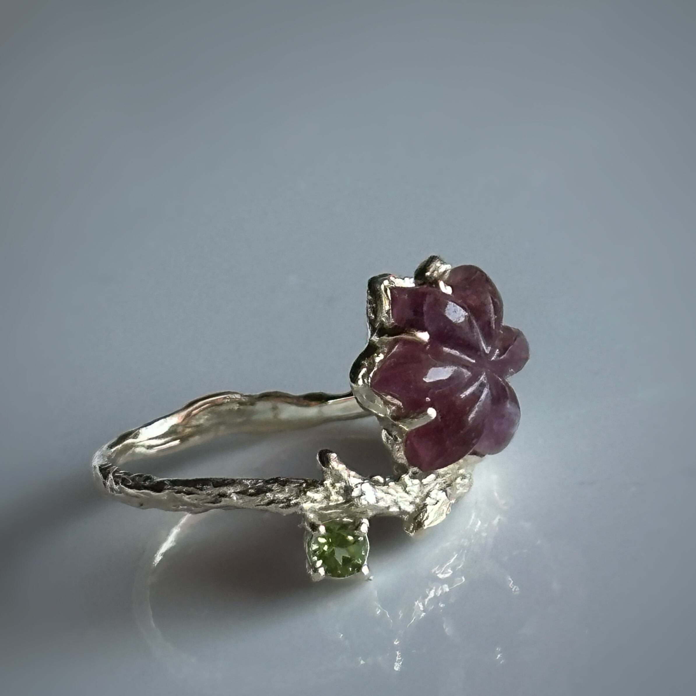 フラワーカービングが施されたトルマリンを、一点物のリングに仕立てました。